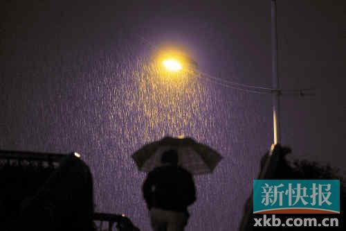 ■昨日黄昏,广州终于迎来了春天里的第一场暴雨,一行人在风雨中前行。新快报记者孙毅/摄