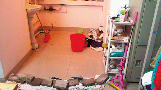 厕所用不了是一回事,关键是让人难以忍受的臭味以及令人作呕的排污物。厕所发生严重堵塞的宿舍,女生已经难以在里面正常生活就寝。在413宿舍,女生们为防排污水倒灌至房间地板上,在厕所门外堆满废弃的衣物,然后用砖块将阳台与房间的地板隔开。有的女生已搬至其他宿舍就寝;有的女生更夸张,用纸巾塞住鼻子,拿着香水,不时地喷一喷。“这已经是我喷的第二瓶了” !