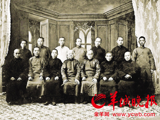 原莲香楼全体股东。正中的白发老人就是广州的茶楼王谭新义