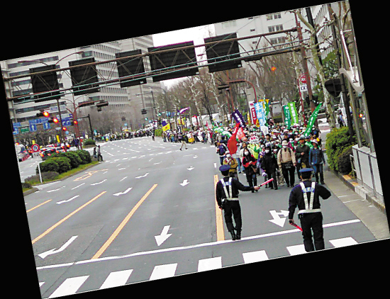 3月10日代表团抵达东京。路上,记者看到长长的游行队伍前往日本国会示威抗议,表达反对建设核电站的诉求,人们愤怒地高喊“反对重启核电站”。而隔天就是东日本大地震两周年,当时大地震引发的福岛核事故让日本民众至今心有余悸。据了解,当天约有1万人参与了游行。