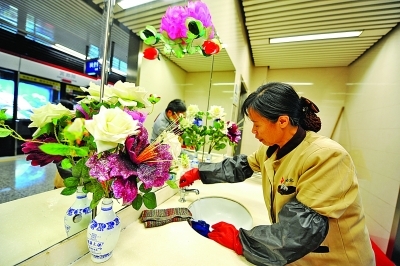 记者了解到,受徐阿姨装点鲜花公厕的启发,附近大行宫站的保洁员也效仿她在地铁站的洗手间里摆起了鲜花。