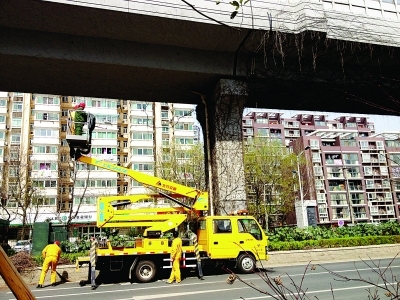 采访中,记者碰巧看见,桥下一辆黄色工程车正将两位工人用液压杆送上十多米高的高架桥下,剪着桥面下的爬山虎。记者上前咨询,工人自称属于南京地铁公司,奉上级指示准备用两个月的时间把雨花西路这一段高架桥桥面下的爬山虎全部剪掉。“枝叶上全是灰,脏死了!”负责捆扎掉落地面爬山虎藤蔓的工人说,爬山虎藏污纳垢对高架桥表面会有腐蚀作用,扩大桥体裂缝,剪掉爬山虎是为保护桥体安全。记者随后致电南京地铁公司,相关负责人称,按规定像雨花西路高架这样的大型高架桥梁,定期需要进行检查,高架桥下长满爬山虎,检测人员无法看清哪里有裂缝,所以要将爬山虎剪掉。“我们和绿化管养部门都打过招呼的,同时我们剪的时候也很小心,没破坏爬山虎的根系。”相关负责人称。