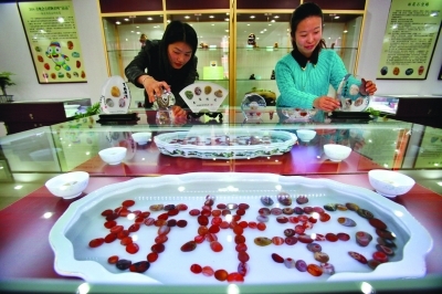 昨天,吉庆社区工作人员正在雨花石科普馆进行最后的布展工作。4月10日,南京首个社区雨花石科普馆将在南苑街道吉庆社区开馆,届时将对市民免费开放。展馆内的数百枚雨花石,由社区居民雨花石收藏家张志多等人提供。扬子晚报记者 宋峤 摄