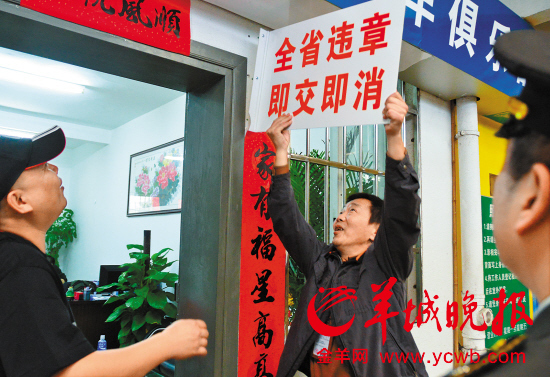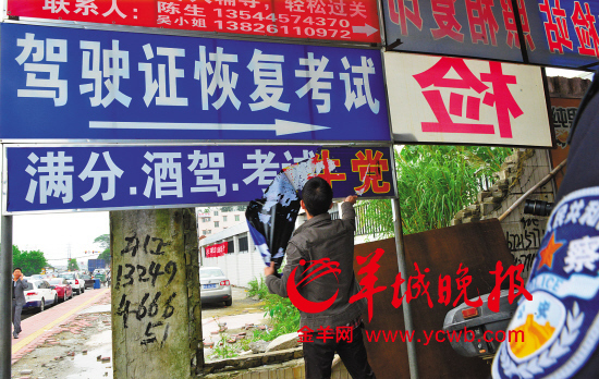执法人员责令拆除虚假违法广告羊城晚报记者 黄巍俊 摄