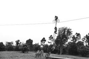 3月30日上午10点,在常州淹城野生动物世界“史上首次虎口空手走钢丝”挑战活动现场,主角未上场之前,先是两名身着红衣的年轻男子展现他们的自行车空中花样表演,两名红衣男子一个挂在梯子上,另一个骑着自行车在空中的钢丝上行走,他们到达老虎领地上空时,6只老虎一起扑了过来,其中一老虎直接蹿了两米多高试图扑上侵犯它们“领空”的表演者。