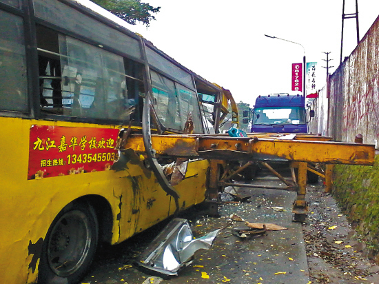 22日清晨7时15分,一阵猛烈的撞击声划破了南海九江镇南方村的宁静。巨响过后,村外的马路上呈现出一幅惨状:一辆黄色的校车撞上了一辆停靠在路边的挂车,挂车尾部撞进了校车里,把整个车身“撕裂”。当时车上载有小学生21人,其中10人在事故中不同程度受伤,3人伤重,1人送医抢救无效死亡。