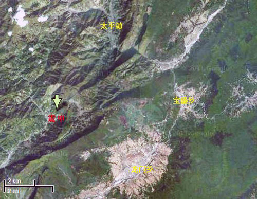 太平镇、宝盛乡、龙门乡与主震源的地理位置