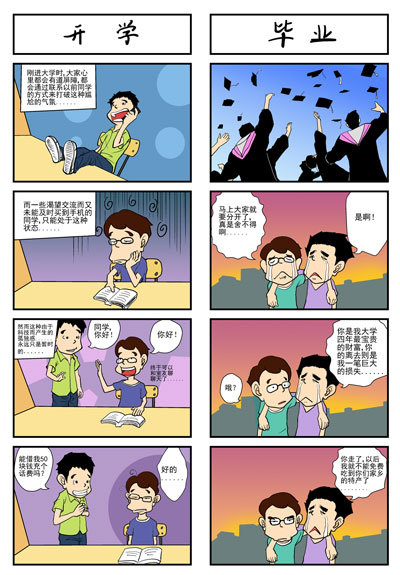 邓元坤和同宿舍的好哥们孙勇商量,决定创作一幅四格漫画,为大学“舍友关系”传递正能量。在创作漫画的过程中,邓元坤同学负责设计人物角色,孙勇同学负责着色和后期处理,两人配合得十分默契。画面中,两个舍友从最初的陌生孤独,到后来的相互帮助,再到毕业前的依依惜别,将和谐有爱的同学情表现得活灵活现。
