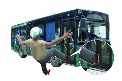 老太一脚踏上公交车门台阶 车门突关致其倒向门外受伤