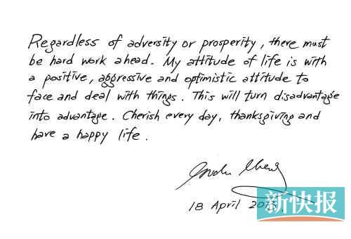 无论逆境或顺境,都要拼搏进取。我的处世就是用积极、进取、乐观的态度去面对及处理事情,这样就无往而不利。珍惜每一天,感恩,才有快乐的人生。--郑玉桂