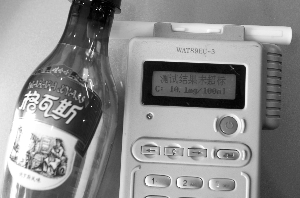 喝下一支藿香正气水后,立即对着酒精测试仪的吹气口使劲吹了一口气。“嘀”的一声,酒精测试仪上显示出了酒精含量:65.1mg/100ml。喝一口水,大约3分钟后,对着吹气口再长吹一口气,酒精测试仪上的数字有了很大的变化,此时酒精含量显示为0。
