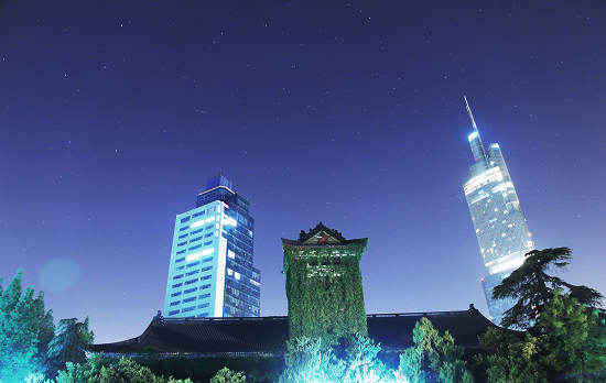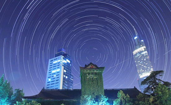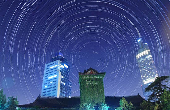 仲东来介绍说拍摄星轨图是很多摄影爱好者都喜欢课题,他的这组照片拍摄于上周日,“下过雨之后的晴天、空气污染低、不能用太多的灯光是拍摄星轨图必须要有的环境条件。”仲东来解释,他的这组“斗转星移”图就是从11点半在紫峰大厦的灯关了之后开始拍摄的,一直持续到凌晨一点半。仲东来说拍摄这组星轨图需要定时快门线设置好拍摄参数,他这次的曝光时间11秒,间隔1秒,连拍了600张。