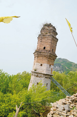 唐悟空禅师塔倾斜严重塔身仅靠一根钢架支撑