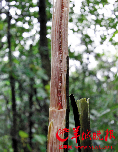 30日,羊城晚报记者来到鼎湖山,果然见到那株会流红色血液的树木。它生长在一个沟谷溪流旁边,看上去,树高约两三米,叶子极似心形。折断处的树芯部位为疏松植物纤维状,似一条“血管”,破裂处流出鲜红色液体,极似人体血液,用手挤捏,觉得液体有些黏稠。十多厘米的树芯处,红色液体斑点处处,似要慢慢渗透出来。