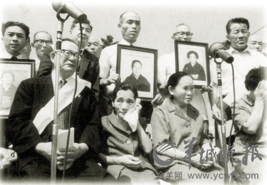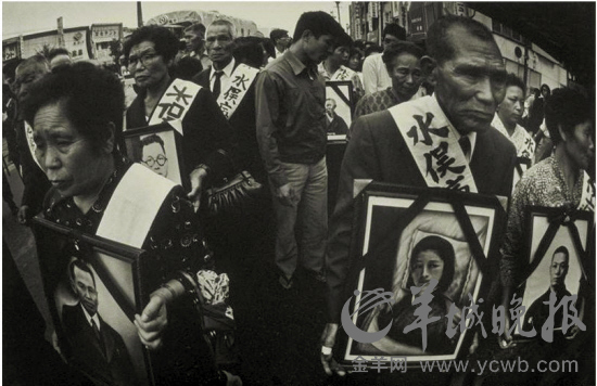 对氮肥公司诉讼期间,水俣病患者拿着他们死去的亲人的照片(尤金·史密斯《水俣》系列)