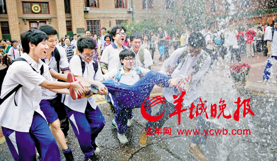 英语收卷铃声响起不久,培正中学校园内的喷泉就涌出水花,以此祝贺高三学子们圆满完成高考。在一群男生看来,喷泉则成了狂欢发泄的好场所,交卷后几名男生在喷泉边玩起猜拳游戏,输者会被众人扔进水池,“清凉”一下。转眼间,几个人变成了“落汤鸡”。引得大家哈哈大笑。