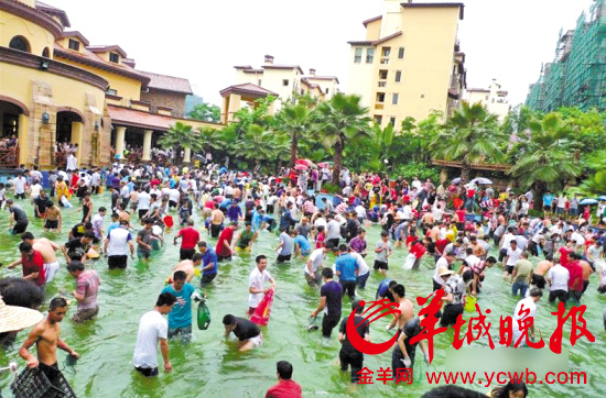 首日,活动开始仅15分钟,当天投放的2000条、5000多斤大鱼就被摸了一干二净。捉鱼比看龙舟赛来得实际,市民大赞该小区开发商大方。