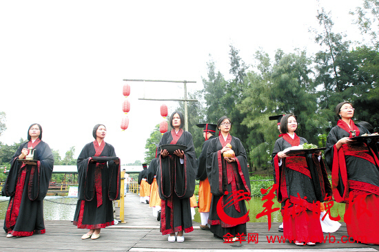 羊城晚报东莞讯 记者唐建丰摄影报道: 袅袅琴音、悠悠箫笛,身着汉服的青年男女,整理冠服、净手、上香、诵祭文、三拜屈原……这一幕并不是出现在古装剧里,而在东莞松山湖倾情上演。12日上午,东莞松山湖梦幻百花洲景区的大草坪边,一场仿照古代的大型祭祀典礼在湖边的平台上举行。来自东莞“莞香汉韵文化社”的数十名汉服爱好者,身着汉服,双手作揖,以古代祭祀礼仪来祭奠屈原。该活动成为松山湖梦幻百花洲景区内最有趣的一道风景,让不少市民前来围观,惊叹仿佛“穿越”回古代。