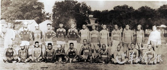 1928年7月,第二集团军足球队与保定同仁中学(今保定一中)足球队进行足球比赛。后排左一为韩复榘(裁判、第三方面军总指挥),后排右一为孙良诚(裁判、第一方面军总指挥)