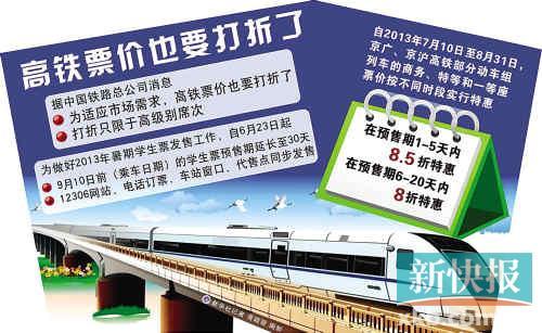中国铁路总公司昨天宣布,为适应市场需求,自7月10日至8月31日,京广、京沪高铁部分动车组列车的商务、特等和一等座票价按不同时段实行特惠。二等座票并无优惠,而且在预售期1~5天内(含当天,下同)是实行8.5折特惠,在预售期6~20天内才实行8折特惠。其中起始站点在广州南站的高铁列车共有19趟,广州旅客可以登录中国铁路客服中心网站(www.12306.cn)或拨打95105105订票电话购票。