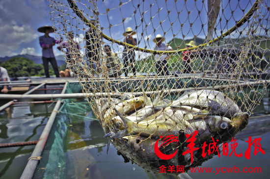 连日来,贺州八步区村民忙着在自家网箱里打捞死鱼 羊城晚报记者 陈文笔 摄