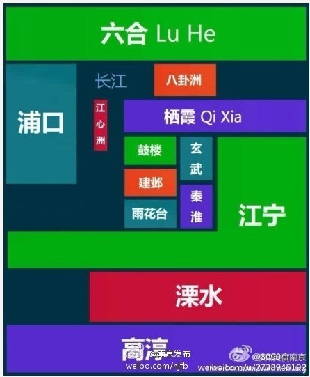 此外,不少网友还强烈期待自己家乡的几何地图。果然,就在江苏几何地图出炉不久,@南京发布便在微博中贴出最新绘制的南京抽象地图。与省地图不同的是,南京地图是一个规矩的长方形,南京11个区包括两个洲也都是规则的矩形,同时,长江也在图中占据了“一席之地”。此图一出,两个多小时内便被转载了500多次,评论近200次,很多网友尤其是南京网友立刻展开了热烈的讨论,不少人直呼,“快看,这不是俄罗斯方块么,是玩游戏的节奏么。”