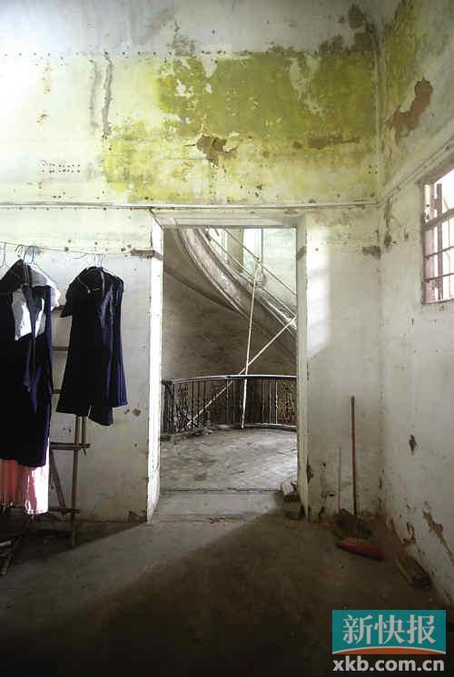 由于昨日下午一直下雨,新快报记者现场看到公馆2楼走廊内晾了不少衣物。走廊的右侧则是冲凉房和洗手间,穿过走廊就能走到2楼旋梯平台。平台左侧则通往大宅的天井,天井处也有一道上下的木梯,不过已经日久失修。旋梯原有的木栏杆只剩下3楼和4楼的一截,其余地方均被竹竿取代。