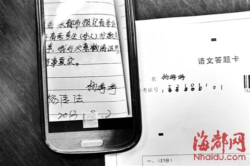 杨婷婷写给本报记者的笔迹与考卷笔迹对比