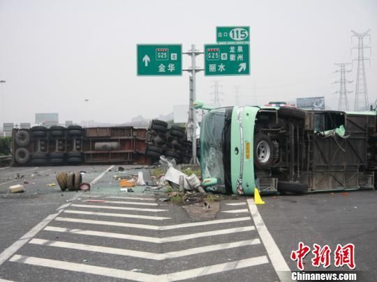 中新网丽水8月2日电 2日上午9时55分,金丽温高速丽水段往金华方向,富岭互通处,浙江温州一旅游大巴主线倒车,致半挂车追尾侧翻。据初步了解,事故中半挂车上有1人死亡1人受伤,客车上有多人受伤,已经送往医院救治。