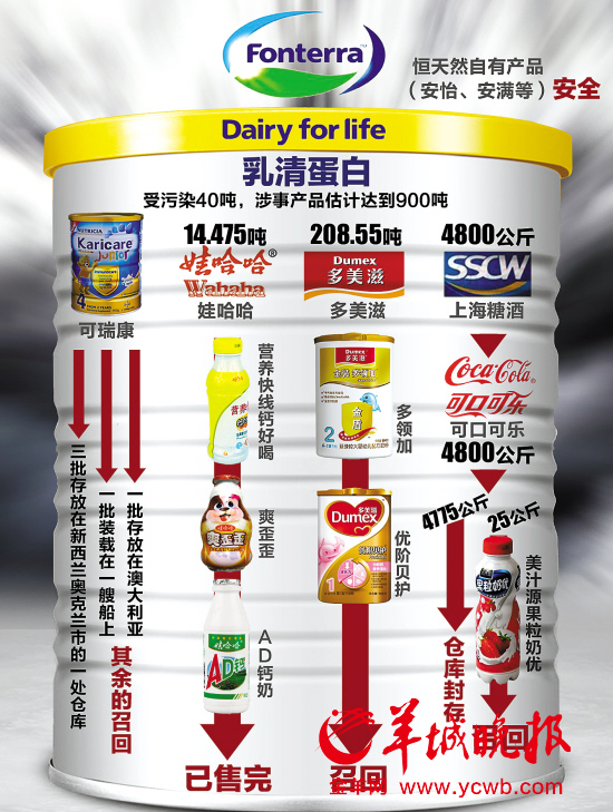 史毕根斯说,公司共有3个批次38吨多的浓缩乳清蛋白粉受到污染,其中21吨被销售给了3家饮料公司和3家动物饲料公司,还有18吨被恒天然用于生产半成品基粉后销售给乳制品生产商。这些企业涉及可口可乐、娃哈哈、纽迪西亚、达能集团的多美滋等企业。