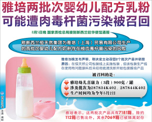 国家质检总局5日晚接到新西兰驻华使馆通报,称新西兰恒天然集团为雅培(上海)贸易有限公司生产的两批次婴幼儿配方奶粉存在被肉毒杆菌污染的风险。质检总局已要求雅培公司履行主体责任,召回相关产品,切实保护中国消费者健康。