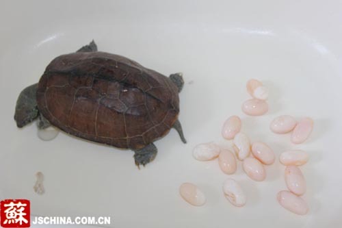 记者现场看见,这只乌龟块头比成人手掌略大一些,有两斤多重,爪子与头呈乌黑色,古铜色的背上布满网格状斑纹。而昨天产下的15枚蛋跟鸽子蛋差不多大,呈玉白色,有的依稀可见红色的血丝,像水中的鹅卵石一样呈半透明。