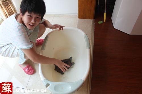 龟是通人性的,时间长了,就会和主人有感情。“它的食物是小鱼小虾、猪肉米饭之类,隔一天喂一次,有时家人外出旅游,一周左右不回来,多放点米饭在盆里就行了。”吕先生坦言乌龟当宠物要比养其他宠物方便得多。“小家伙很机灵,每次喂食,家人喊着“吱吱——”,它就冲着喊声,掉过屁股,伸长脖子,前爪向缸沿直爬。吕先生的家人还会定期把它抱到客厅里,让它爬来爬去,活动活动筋骨。有时,家里来了客人,就把乌龟放在客厅里,让它“走秀”一番。