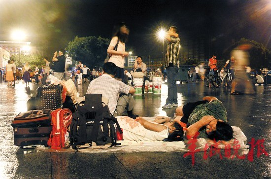 羊城晚报讯记者梁爽报道:因广州火车站全部列车停运,昨夜至今日凌晨,大量候车和退票旅客滞留候车厅和广场;广州东站部分列车延误10小时后停运,部分滞留旅客围堵值班站长。记者了解到,此时正值暑假末期,不少身在广州的“小候鸟”急着回老家开学,但短期内高铁和长途汽车一票难求,广州往湖南、沈阳等地的飞机票价格也被炒高。