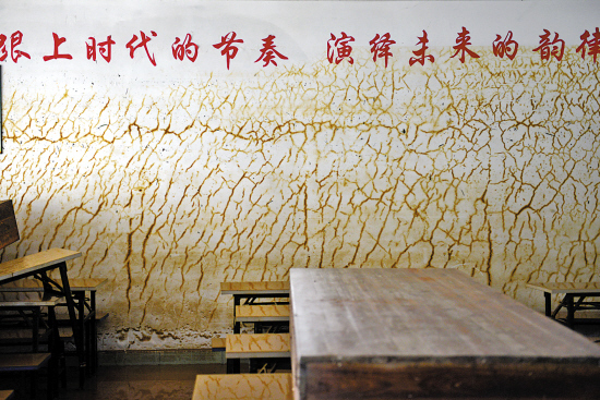 8月20日,围困英德市浛洸镇英西中学的洪水已经退去,学校课室的墙上留下了被洪水浸泡了的痕迹 羊城晚报记者 林桂炎 摄