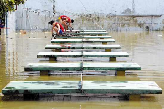 8月20日,围困英德市浛洸镇英西中学的洪水大部分已经退去,而一排乒乓球桌还被淹了一大截,学生们正在清洗体育用品 羊城晚报记者 林桂炎 摄