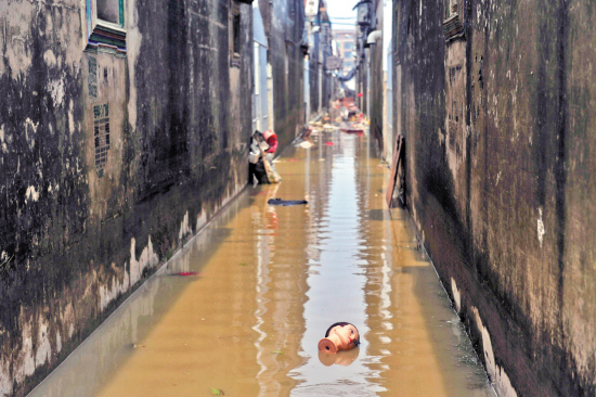 新快报讯陈店镇的柯围村,洪水渐渐退去,在民居1米高的墙壁上,还残留着洪水浸泡过的痕迹。324国道人来人往,前日,这段路还在水中,昨日中午,记者来到这里时,居民们都在扫着屋内屋外的积水和淤泥。