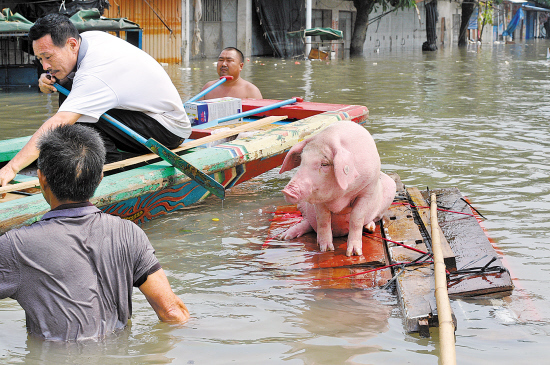 猪是财富,在过腰深的水里,猪可以享受坐“船”的待遇 羊城晚报记者 黄巍俊 摄
