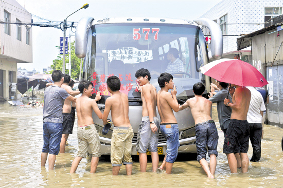 8月20日,普宁占陇镇衫埔村车站,村里的年轻人将一辆泡过水的中巴推出到大街上冲洗 羊城晚报记者 宋金峪 摄