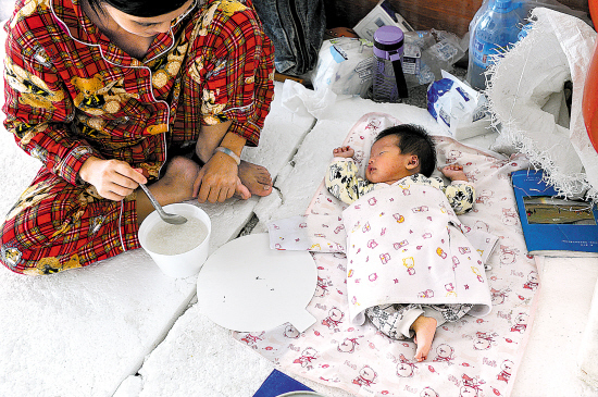 记者了解到,一些老人和小孩出现了不同程度的发烧、腹泻等病情,目前,安置点急需医药,特别是一些小孩用的感冒和发烧药品。“前两天我们这里一个孕妇要生产,找不到医生,只好让一个懂一点接生的村民为孕妇接生,所幸母子平安。”陈伯说。