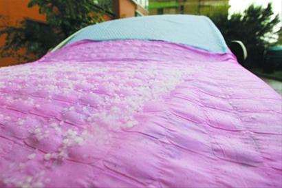 昨日傍晚,风雨冰雹过后,在沈阳浑南地区,一轮彩虹纵贯天空。北国网、辽沈晚报首席记者 吴章杰 摄为防冰雹,一些车主忙着给自己的车盖上被子。