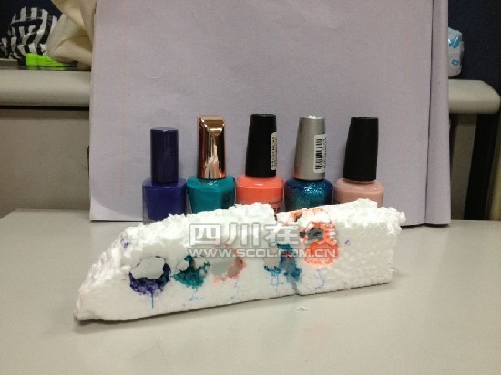 四川在线消息(四川在线记者 陈雪 赵雨欣)网络热传指甲油腐蚀性强,几秒钟内能将泡沫板蚀穿,把爱涂指甲油的女性吓了一大跳。市面上形形色色的指甲油真的会腐蚀指甲吗?涂指甲油会对人体带来危害吗?今日,记者联合四川大学化学专家,通过把五种不同价位、不同品牌的指甲油涂在泡沫板、塑料袋、鸡蛋壳和皮带上面的反应来做比对。实验表明,10秒钟内,泡沫板被严重腐蚀,1分钟后被蚀穿。