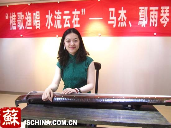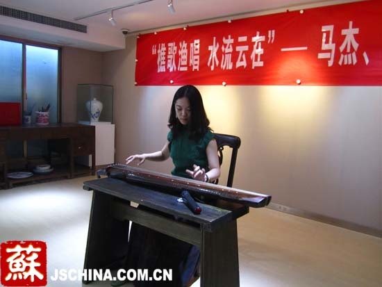 中国江苏网9月3日讯(记者 赵筱青)“这是唐代诗人皮日休和陆龟蒙所作的琴曲,全曲描绘了渔翁豪放不羁的醉态,是一首精致的琴曲小品。”美女琴师鄢雨纤纤素手的古琴弹拨配合着著名古琴大师马杰的描述,使得人们不仅听到了古琴,还听懂了古琴。就在今天这个秋日的下午,马杰与学生鄢雨带着一架雅致的仿古琴出现在全国首家民办社区文化艺术中心——南京金盏花文化艺术中心。除了精湛的古琴技艺,一同展示的还有33幅师徒二人的书画作品。正所谓“琴棋书画,样样齐全”。