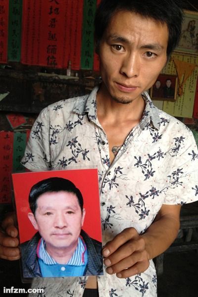程兴贵的儿子程正鹏拿着父亲的遗照。程兴贵自杀后,政府补偿程家6000多块钱,并终于认定了程兴贵的代课教龄。 (南方周末记者雷磊/图)