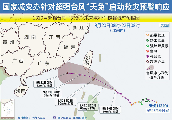 据新华社电20日10时,国家减灾办针对第19号超强台风“天兔”可能造成的影响紧急启动救灾预警响应,指导地方民政部门及时做好灾害应急救助各项准备工作,最大限度减轻灾害造成的损失。