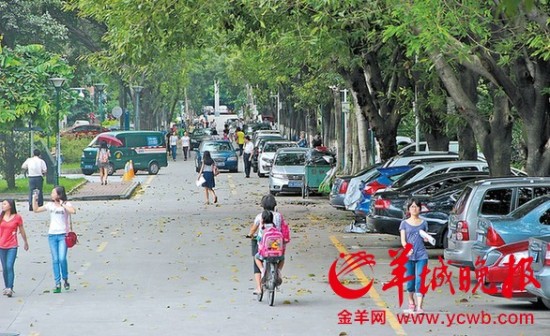 暨大校园内, 部分校道半边被车占,人车混行半边道