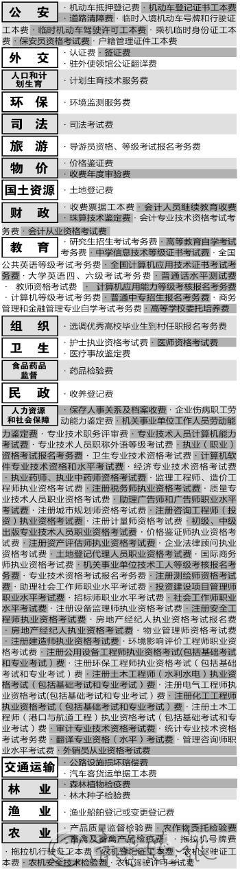 其中,免征项目还涉及公安部门的机动车抵押登记费、道路清障费、保安员资格考试费、户籍管理证件工本费、机动车登记证书工本费等8项;以及食药部门的药品检验费、民政部门收养登记费。