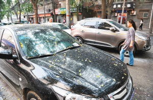 四府街的东边,停着几辆车,车上全部被黏液附着,树上一些落下的白毛粘在黏液上,看上去白蒙蒙一片。车主赵师傅正在车旁挠头,“没想到停了一晚上车,就变成这样了,前天才洗的,这又要去洗了。”