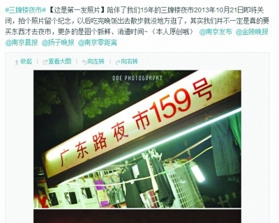 “陪伴了我们15年的三牌楼夜市2013年10月21日将关闭,拍个照片留个纪念,以后吃完晚饭出去散步就没地方逛了,其实我们并不一定是真的要买东西才去夜市,更多的是图个新鲜、消遣时间。”网友“孫一不二”在新浪微博发了一组自己原创的照片,照片上,在微黄的灯光下,夜市的摊位充满了市井气息,不少摊位上赫然写着“夜市取缔,全场抛货”的字样,有些摊位前还聚集了不少购物的人群。这条微博被转发了近两百次,不少网友跟帖留言。网友“南京莞儿”回忆说,“对这里印象特别深,当年饭后散步就是逛夜市。”