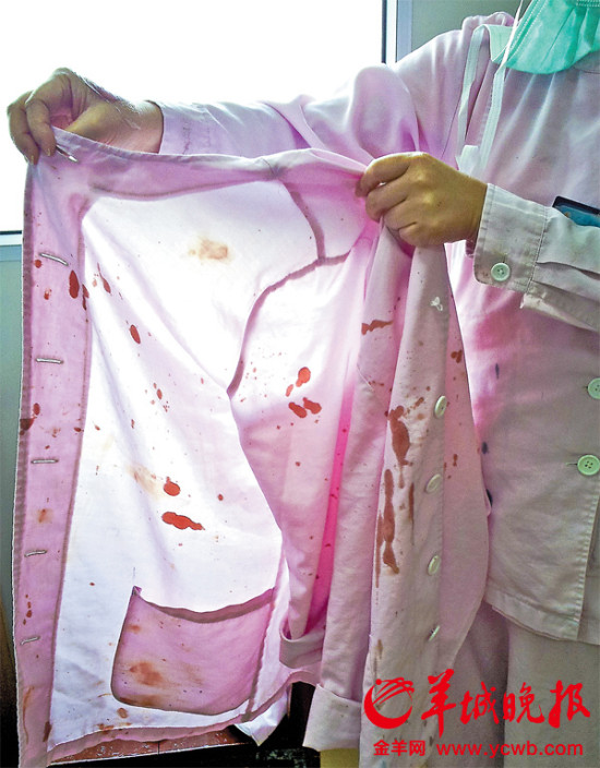 被打伤的医护人员工作服上血迹斑斑 羊城晚报记者 何奔 摄